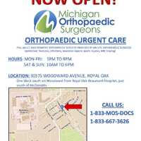 Access an urgent care orthopedics specialist Monday-Thursday 4pm-8pm at MOC 4220 W 95th St. The clinic is located inside the Michigan Orthopaedic Surgeons building at 30575 Woodward Ave.